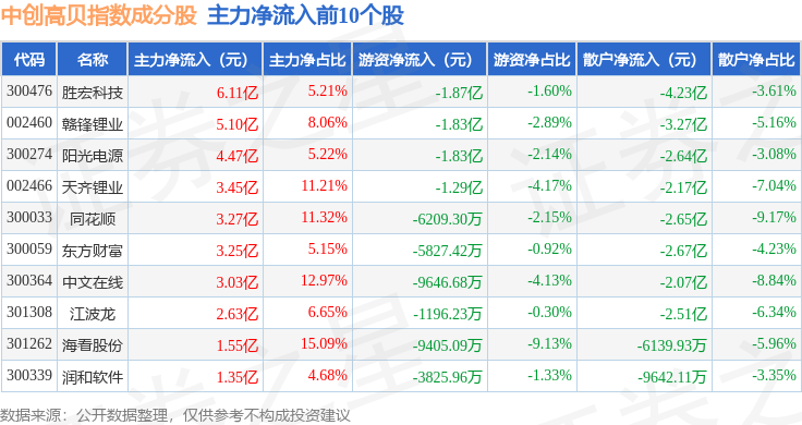 资金流向方面,中创高贝(399666)指数成份股当日主力资金净流出合计33.47亿元,游资资金净流入合计5.58亿元,散户资金净流入合计27.9亿元。成份股资金流向详情见下表: