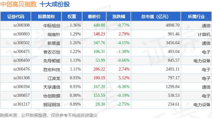 中创高贝(399666)指数十大成份股详情如下: