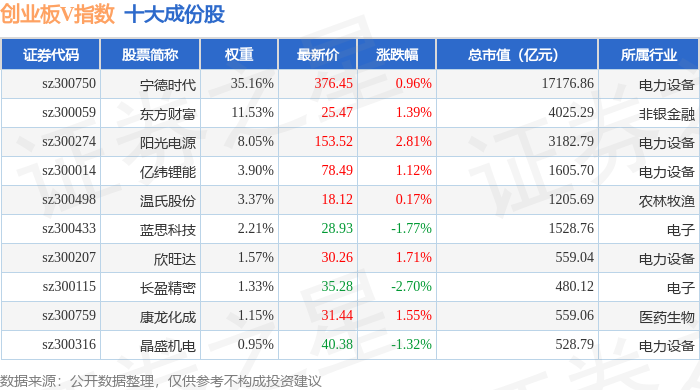 创业板V(399668)指数十大成份股详情如下: