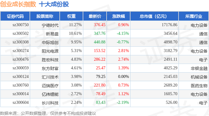 证券之星消息,10月23日,创业成长(399667)指数报收于5133.75点,跌0.36%,成交1114.26亿元,换手率1.92%。当日该指数成份股中,上涨的有26家,阳光电源以2.81%的涨幅领涨,下跌的有23家,天孚通信以6.36%的跌幅领跌。