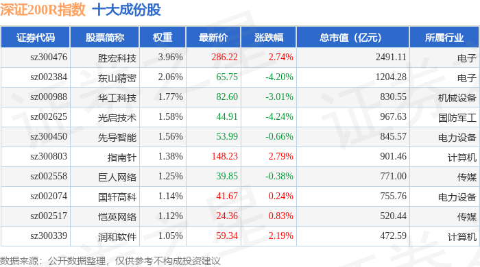 证券之星消息,10月23日,深证200R(399679)指数报收于5993.49点,涨0.42%,成交1542.32亿元,换手率1.7%。当日该指数成份股中,上涨的有133家,深圳能源以9.96%的涨幅领涨,下跌的有64家,乖宝宠物以14.42%的跌幅领跌。