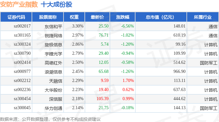 证券之星消息,10月23日,安防产业(399693)指数报收于4875.88点,涨1.01%,成交224.49亿元,换手率2.23%。当日该指数成份股中,上涨的有33家,迪普科技以14.86%的涨幅领涨,下跌的有16家,东信和平以6.56%的跌幅领跌。