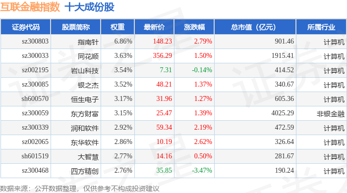 资金流向方面,互联金融(399805)指数成份股当日主力资金净流入合计3.35亿元,游资资金净流出合计3.26亿元,散户资金净流出合计941.91万元。成份股资金流向详情见下表: