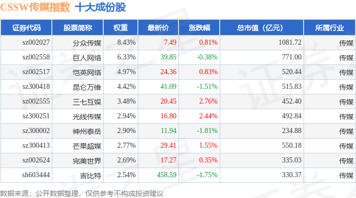 资金流向方面,CSSW传媒(399810)指数成份股当日主力资金净流入合计2.8亿元,游资资金净流出合计2.28亿元,散户资金净流出合计5228.64万元。成份股资金流向详情见下表: