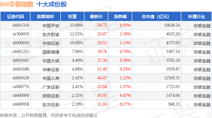 800非银(399966)指数十大成份股详情如下: