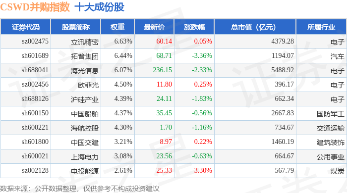 证券之星消息,10月23日,CSWD并购(399992)指数报收于2095.97点,跌0.44%,成交459.5亿元,换手率1.72%。当日该指数成份股中,上涨的有47家,特力A以10.01%的涨幅领涨,下跌的有51家,五新隧装以7.13%的跌幅领跌。