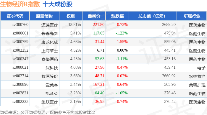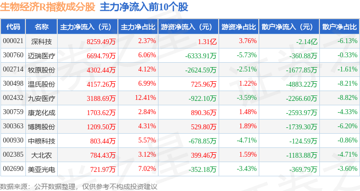 资金流向方面,生物经济R(470038)指数成份股当日主力资金净流出合计5.02亿元,游资资金净流入合计1.48亿元,散户资金净流入合计3.54亿元。成份股资金流向详情见下表: