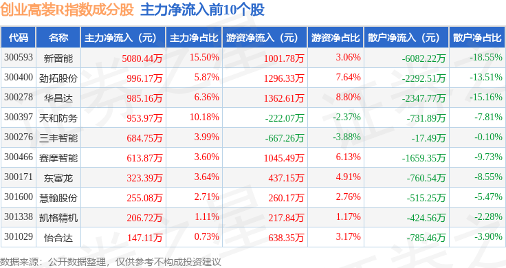 资金流向方面,创业高装R(470040)指数成份股当日主力资金净流出合计12.66亿元,游资资金净流入合计2.48亿元,散户资金净流入合计10.18亿元。成份股资金流向详情见下表: