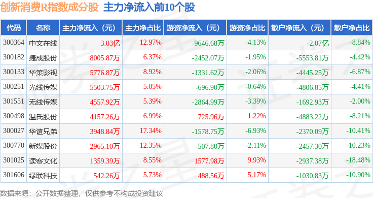 资金流向方面,创新消费R(470041)指数成份股当日主力资金净流出合计1442.48万元,游资资金净流入合计947.83万元,散户资金净流入合计494.66万元。成份股资金流向详情见下表: