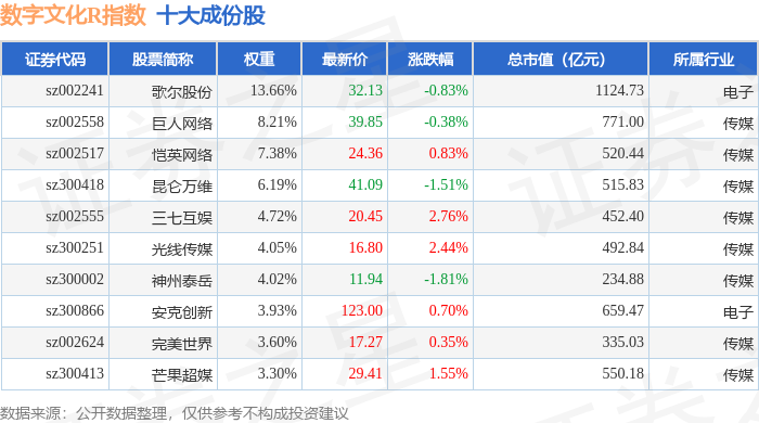 资金流向方面,数字文化R(470047)指数成份股当日主力资金净流入合计3.34亿元,游资资金净流出合计1.2亿元,散户资金净流出合计2.14亿元。成份股资金流向详情见下表: