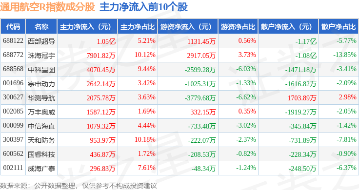 资金流向方面,通用航空R(480076)指数成份股当日主力资金净流出合计3.58亿元,游资资金净流入合计8058.22万元,散户资金净流入合计2.78亿元。成份股资金流向详情见下表: