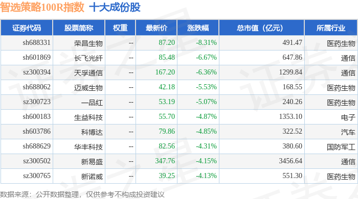 证券之星消息,10月23日,智选策略100R(489015)指数报收于4744.16点,跌1.29%,成交1360.81亿元,换手率1.52%。当日该指数成份股中,上涨的有33家,传音控股以3.11%的涨幅领涨,下跌的有67家,荣昌生物以8.31%的跌幅领跌。