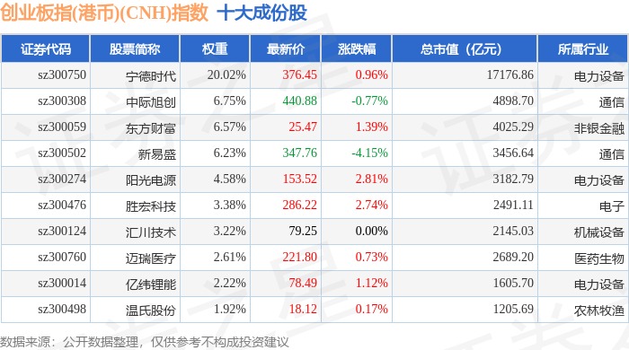 创业板指(港币)(CNH)(970006)指数十大成份股详情如下: