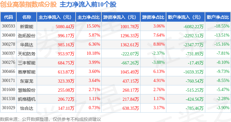 资金流向方面,创业高装(970040)指数成份股当日主力资金净流出合计12.66亿元,游资资金净流入合计2.48亿元,散户资金净流入合计10.18亿元。成份股资金流向详情见下表: