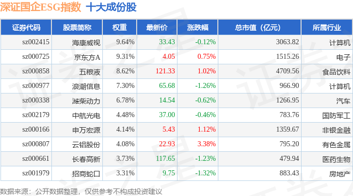 证券之星消息,10月23日,深证国企ESG(970055)指数报收于1396.81点,涨0.24%,成交304.07亿元,换手率0.99%。当日该指数成份股中,上涨的有34家,东方钽业以10.0%的涨幅领涨,下跌的有16家,中材科技以6.01%的跌幅领跌。