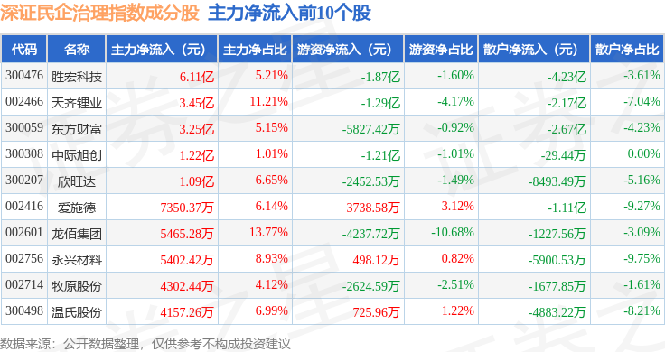 资金流向方面,深证民企治理(970058)指数成份股当日主力资金净流出合计14.51亿元,游资资金净流出合计8076.19万元,散户资金净流入合计15.32亿元。成份股资金流向详情见下表: