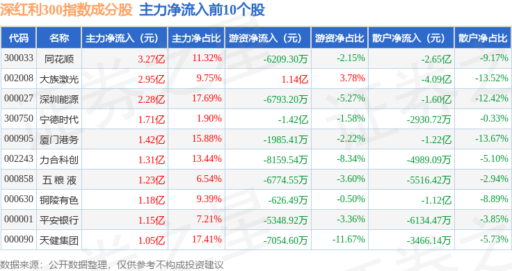 资金流向方面,深红利300(970062)指数成份股当日主力资金净流出合计42.67亿元,游资资金净流入合计8.38亿元,散户资金净流入合计34.29亿元。成份股资金流向详情见下表: