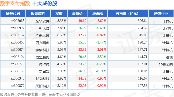 资金流向方面,数字支付(980113)指数成份股当日主力资金净流出合计4.25亿元,游资资金净流出合计1.69亿元,散户资金净流入合计5.94亿元。成份股资金流向详情见下表: