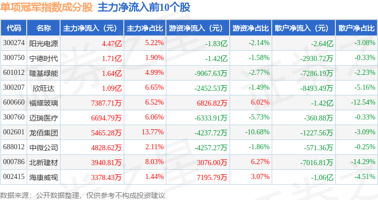 资金流向方面,单项冠军(980150)指数成份股当日主力资金净流出合计15.48亿元,游资资金净流出合计3.57亿元,散户资金净流入合计19.05亿元。成份股资金流向详情见下表: