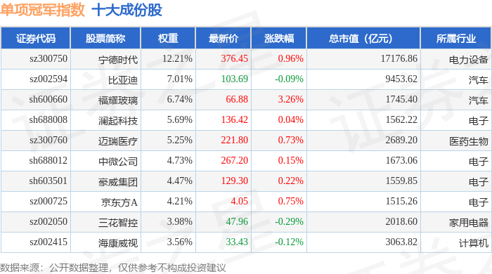 证券之星消息,10月23日,单项冠军(980150)指数报收于8198.05点,涨0.38%,成交861.54亿元,换手率1.28%。当日该指数成份股中,上涨的有28家,福耀玻璃以3.26%的涨幅领涨,下跌的有21家,生益科技以4.87%的跌幅领跌。