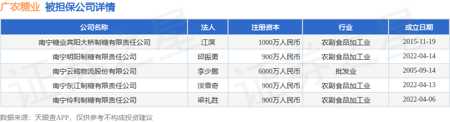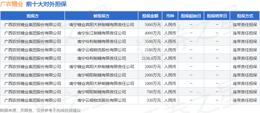 广农糖业10月16日披露12笔对外担保,被担保公司5家。担保金额排在前十的对外担保明细如下表: