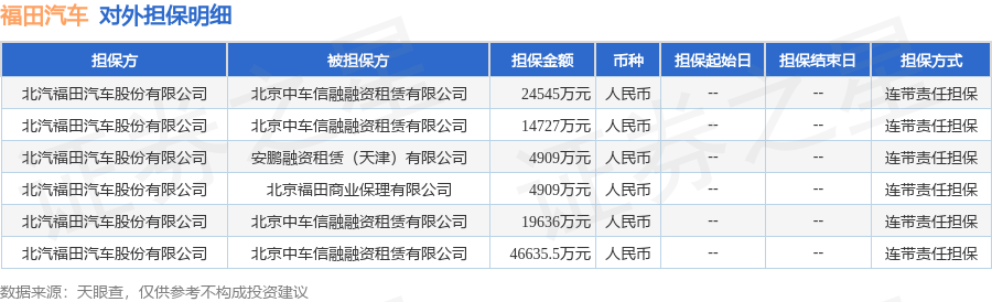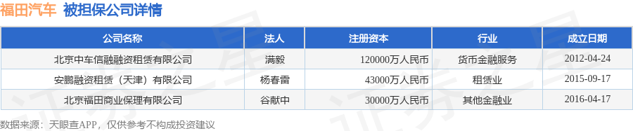 福田汽车10月13日披露6笔对外担保,被担保公司3家。对外担保明细如下表: