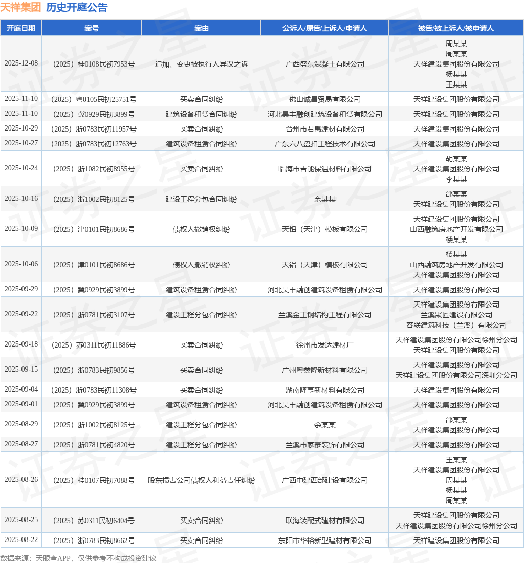 案号:(2025)浙1082民初8955号根据统计,近一年内以天祥建设集团股份有限公司为当事人的历史开庭公告有138则,其中案由为“买卖合同纠纷”的公告以38则居首,其次为“建设工程分包合同纠纷”有21则,“劳动争议”有17则。历史开庭公告(前20条)如下: