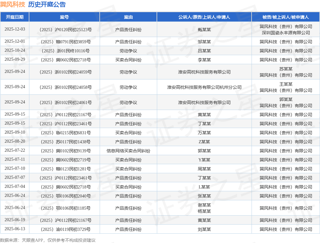案号:(2025)浙01民终10116号根据统计,近一年内以巽风科技(贵州)有限公司为当事人的历史开庭公告有80则,其中案由为“产品责任纠纷”的公告以36则居首,其次为“信息网络买卖合同纠纷”有21则,“买卖合同纠纷”有15则。历史开庭公告(前20条)如下: