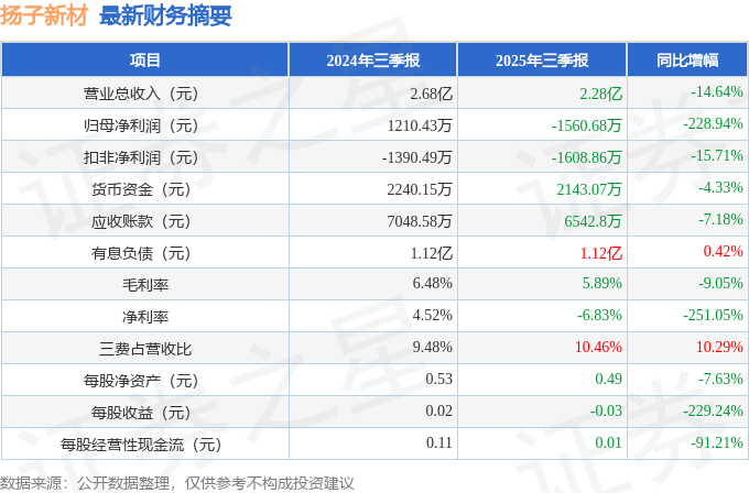 据证券之星公开数据整理,近期扬子新材(002652)发布2025年三季报。截至本报告期末,公司营业总收入2.28亿元,同比下降14.64%,归母净利润-1560.68万元,同比下降228.94%。按单季度数据看,第三季度营业总收入7231.55万元,同比下降12.06%,第三季度归母净利润-375.46万元,同比上升0.78%。本报告期扬子新材公司应收账款体量较大,当期应收账款占最新年报归母净利润比达933.48%。