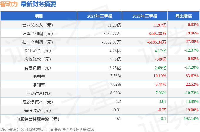 据证券之星公开数据整理,近期智动力(300686)发布2025年三季报。截至本报告期末,公司营业总收入11.97亿元,同比上升6.03%,归母净利润-6445.38万元,同比上升19.96%。按单季度数据看,第三季度营业总收入4.3亿元,同比上升3.3%,第三季度归母净利润-2347.44万元,同比下降13.6%。本报告期智动力盈利能力上升,毛利率同比增幅33.62%,净利率同比增幅22.52%。