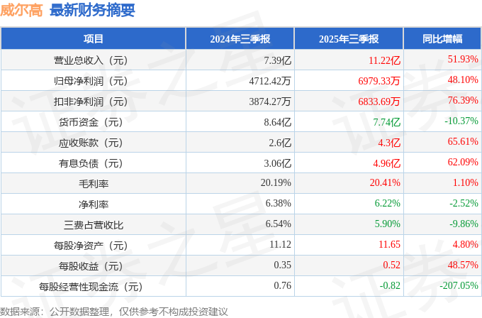 据证券之星公开数据整理,近期威尔高(301251)发布2025年三季报。截至本报告期末,公司营业总收入11.22亿元,同比上升51.93%,归母净利润6979.33万元,同比上升48.1%。按单季度数据看,第三季度营业总收入4.07亿元,同比上升41.33%,第三季度归母净利润2459.08万元,同比上升175.75%。本报告期威尔高应收账款上升,应收账款同比增幅达65.61%。