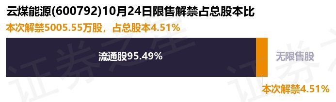 证券之星消息,根据市场公开信息整理,云煤能源(600792)于10月24日将有5005.55万股限售股份解禁,为公司定向增发机构配售股份,占公司总股本4.51%。(本次数据根据历史公告整理得出,实际情况以上市公司最新公告为准)最近一年内,该股累计解禁6994.45万股,占总股本的6.3%。本次解禁后,公司已无限售股份。具体如下图所示: