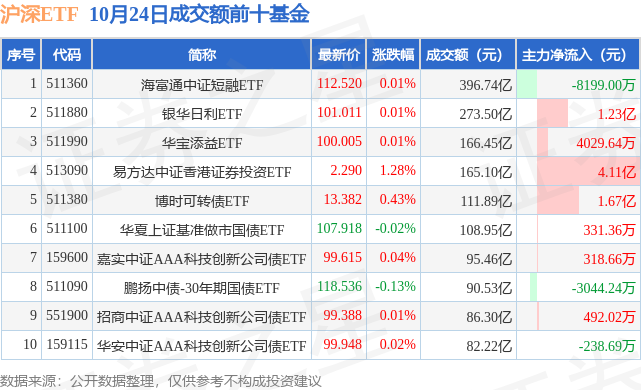 当日沪深ETF成交额前10大ETF基金中8只ETF基金收涨,平均涨幅0.23%,其中短融ETF(511360)以成交额396.74亿元排第一。从主力资金流入看,成交额前10大ETF基金中有7只ETF基金呈现主力资金净流入。