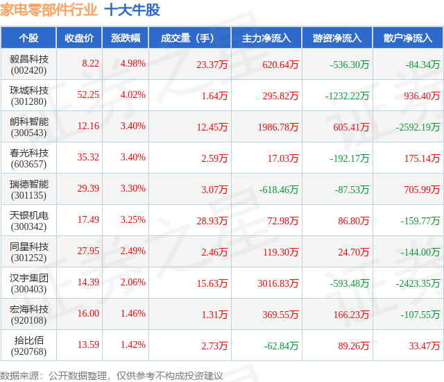 个股表现方面,家电零部件行业当日领涨股为毅昌科技(002420),该股当日报收8.22,上涨4.98%,成交量23.37万,主力资金净流入620.64万元。珠城科技(301280)以上涨4.02%紧随其后,该股当日成交量1.64万,主力资金净流入295.82万元。除此之外,朗科智能(300543)、春光科技(603657)、瑞德智能(301135)均进入当日牛股之列。具体个股列表见下表: