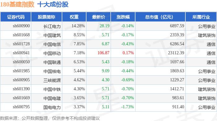 证券之星消息,10月24日,180基建(000025)指数报收于1839.04点,跌0.46%,成交171.75亿元,换手率0.46%。当日该指数成份股中,上涨的有6家,中国卫通以6.27%的涨幅领涨,下跌的有23家,华能国际以2.45%的跌幅领跌。