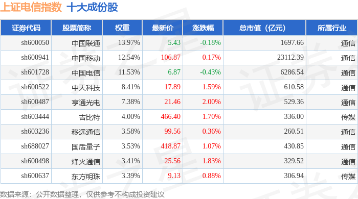 证券之星消息,10月24日,上证电信(000040)指数报收于3913.3点,涨0.36%,成交174.72亿元,换手率0.63%。当日该指数成份股中,上涨的有19家,中国卫通以6.27%的涨幅领涨,下跌的有11家,江苏有线以2.13%的跌幅领跌。