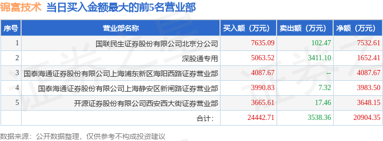 从龙虎榜公布的当日买卖数据来看,北向资金合计净买入1652.41万元。章盟主、上海超短帮等知名游资榜上有名。(知名游资章盟主一般指国泰海通证券股份有限公司上海浦东新区海阳西路证券营业部席位、知名游资上海超短帮一般指国泰海通证券股份有限公司上海静安区新闸路证券营业部席位,根据市场资料整理,仅供参考)