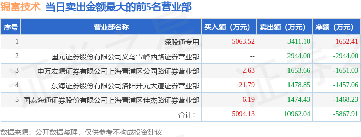 证券之星消息,沪深交易所2025年10月24日公布的交易公开信息显示,锦富技术(300128)因日涨幅达到15%的前5只证券登上龙虎榜。此次是近5个交易日内第1次上榜。