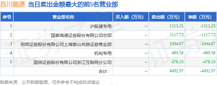 证券之星消息,沪深交易所2025年10月24日公布的交易公开信息显示,百川能源(600681)因有价格涨跌幅限制的日收盘价格跌幅偏离值达到7%的前五只证券登上龙虎榜。此次是近5个交易日内第3次上榜。