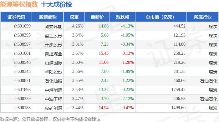 证券之星消息,10月24日,能源等权(000070)指数报收于2774.16点,跌1.45%,成交175.25亿元,换手率0.63%。当日该指数成份股中,上涨的有5家,山煤国际以1.28%的涨幅领涨,下跌的有25家,潞安环能以4.13%的跌幅领跌。