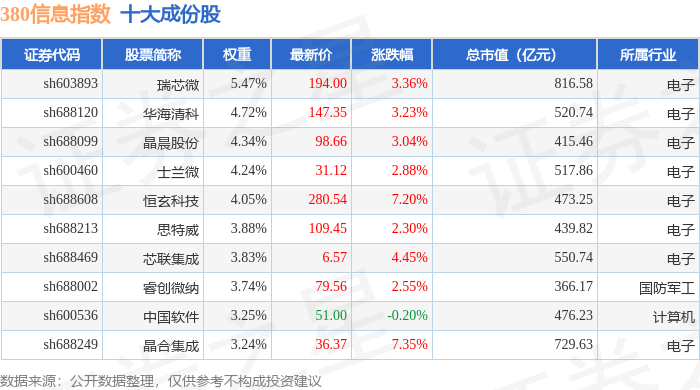 证券之星消息,10月24日,380信息(000111)指数报收于10112.59点,涨3.71%,成交387.13亿元,换手率2.6%。当日该指数成份股中,上涨的有43家,环旭电子以10.02%的涨幅领涨,下跌的有2家,中望软件以0.78%的跌幅领跌。