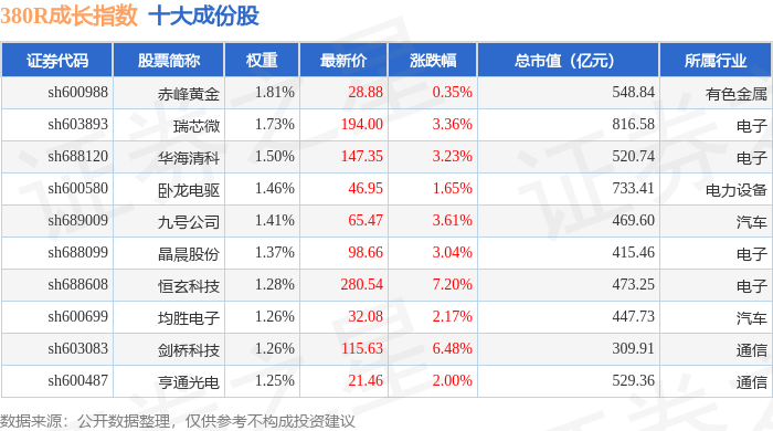 证券之星消息,10月24日,380R成长(000119)指数报收于4322.95点,涨1.91%,成交1369.33亿元,换手率1.73%。当日该指数成份股中,上涨的有178家,环旭电子以10.02%的涨幅领涨,下跌的有102家,山西焦化以7.41%的跌幅领跌。