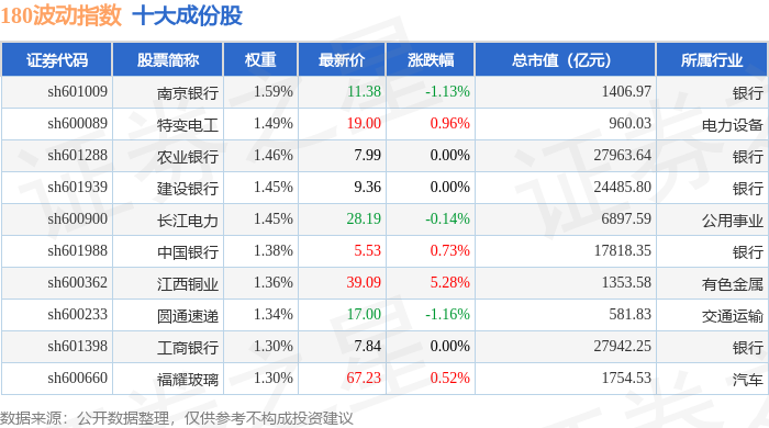 证券之星消息,10月24日,180波动(000129)指数报收于15431.67点,跌0.3%,成交1018.83亿元,换手率0.41%。当日该指数成份股中,上涨的有32家,江西铜业以5.28%的涨幅领涨,下跌的有63家,恒力石化以4.15%的跌幅领跌。