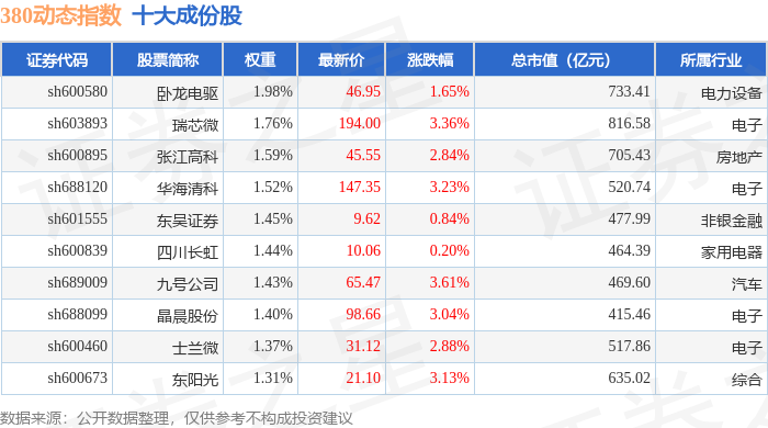 证券之星消息,10月24日,380动态(000141)指数报收于3874.24点,涨1.86%,成交982.19亿元,换手率1.86%。当日该指数成份股中,上涨的有128家,中国卫星以10.01%的涨幅领涨,下跌的有60家,长白山以4.72%的跌幅领跌。