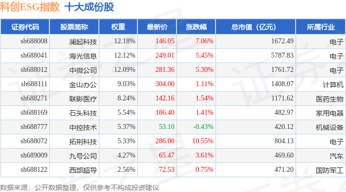 证券之星消息,10月24日,科创ESG(000691)指数报收于1517.73点,涨3.9%,成交538.81亿元,换手率1.5%。当日该指数成份股中,上涨的有39家,拓荆科技以10.55%的涨幅领涨,下跌的有10家,南网科技以2.33%的跌幅领跌。