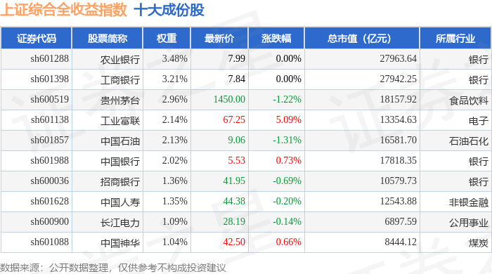 上证综合全收益(000888)指数十大成份股详情如下: