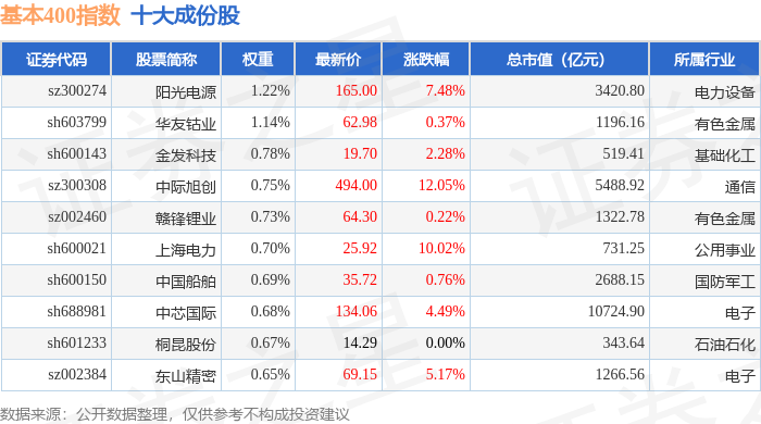 基本400(000966)指数十大成份股详情如下: