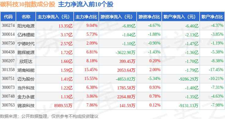 资金流向方面,碳科技30(399030)指数成份股当日主力资金净流入合计22.86亿元,游资资金净流出合计3.66亿元,散户资金净流出合计19.2亿元。成份股资金流向详情见下表: