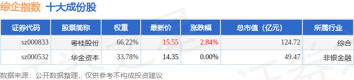 证券之星消息,10月24日,综企指数(399249)报收于2737.78点,涨1.95%,成交10.79亿元,换手率8.63%。当日该指数成份股中,上涨的有1家,粤桂股份以2.84%的涨幅领涨。
