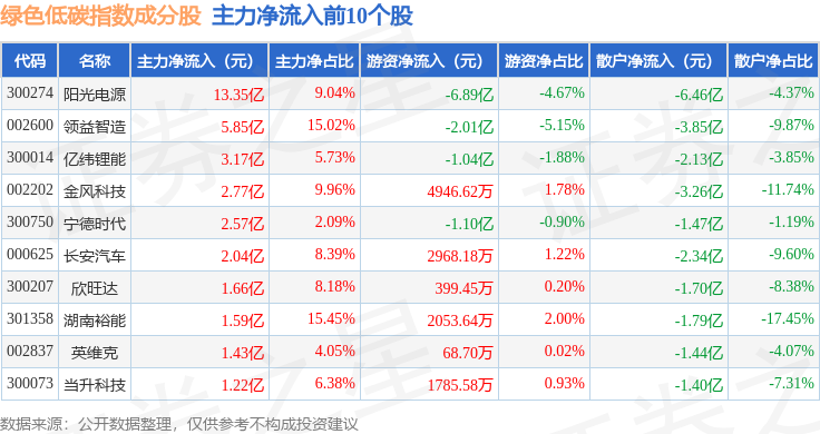 资金流向方面,绿色低碳(399258)指数成份股当日主力资金净流入合计30.42亿元,游资资金净流出合计7.08亿元,散户资金净流出合计23.34亿元。成份股资金流向详情见下表: